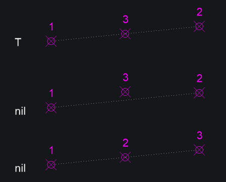 - pt3 がpt1,pt2 間の線上にある点なら T、そうでなければ nil